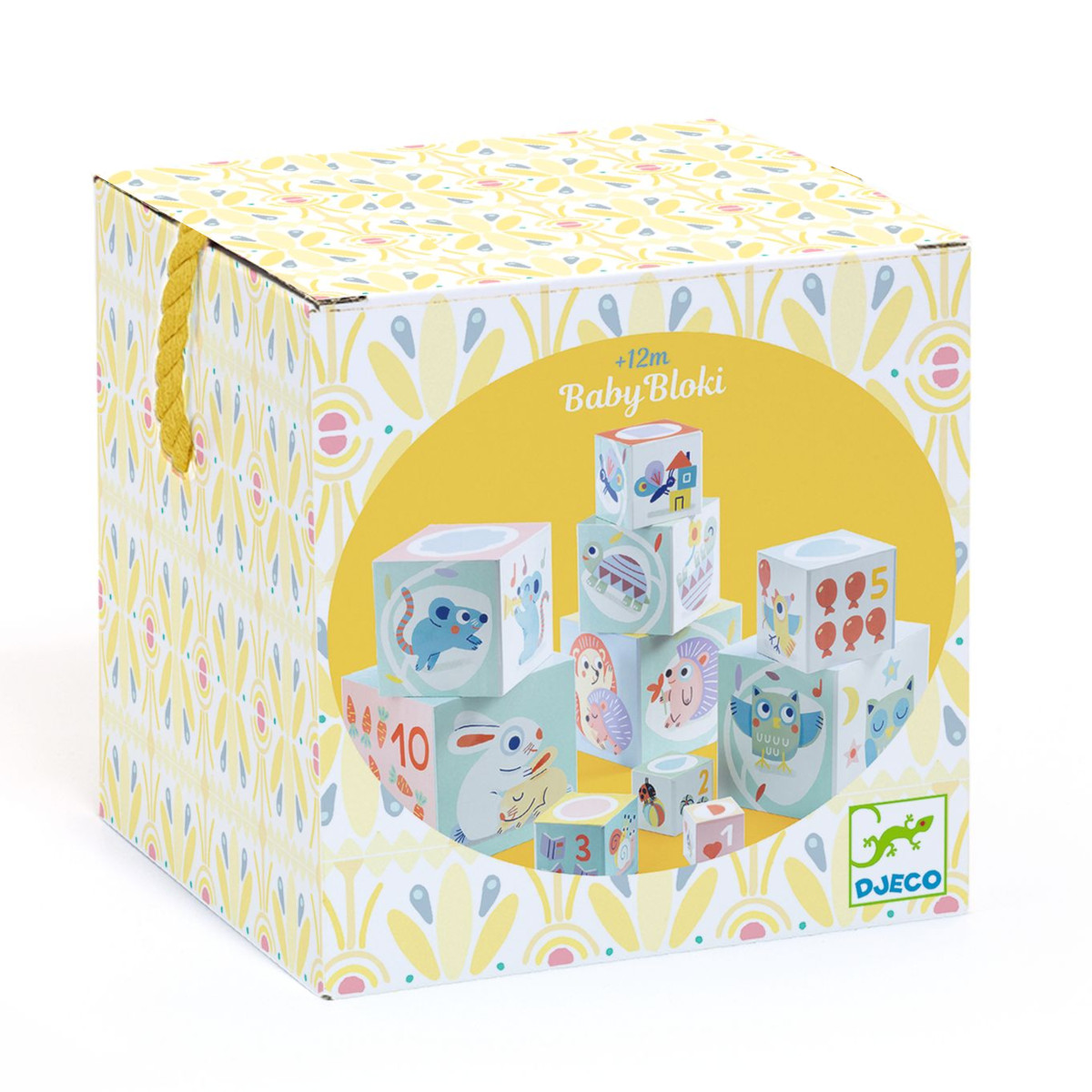 Baby bloki - Cubi Impilabili è un set di 10 cubi in cartoncino spesso. I cubi sono pieni su 5 lati e presentano disegni a tema animali con colori pastello. Su un lato hanno un numero e la corrispondente quantità di illustrazioni, e i numeri corrispondono alle dimensioni dei cubi, che presentano misure proporzionalmente crescenti in modo da poter essere infilati uno dentro l'altro o impilati a formare una piramide alta 86 cm.
