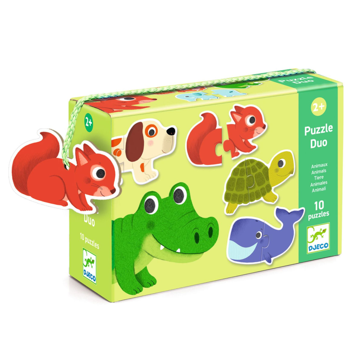 Puzzle Duo Animaliè un set di 12 puzzle da due pezzi in cartone pressato, adatto dai 2 anni in su. I puzzle formano 12 animaletti sagomati. Ogni puzzle è caratterizzato dalla metà anteriore o posteriore di un animale. Tutti i puzzle hanno il medesimo incastro.