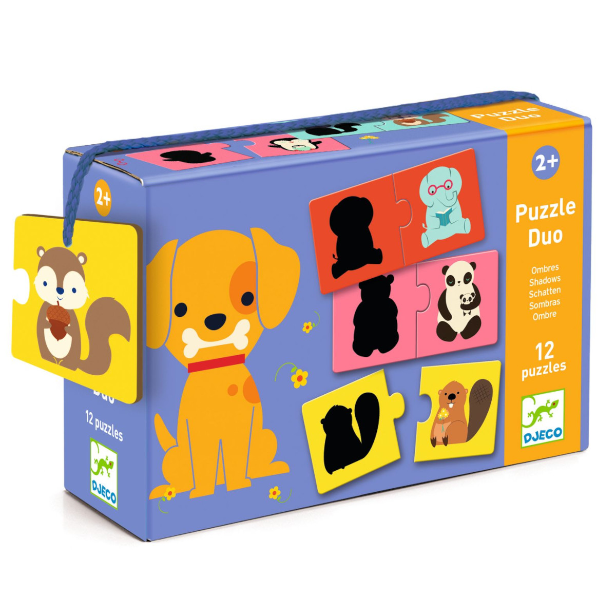 Puzzle Duo Ombre è un primo puzzle a 2 pezzi che unisce all'associazione di immagini e colori anche una prima associazione basata sul riconoscimento della stessa immagine (l'animaletto) e la sua ombra. Adatto dai 2 anni in su.
