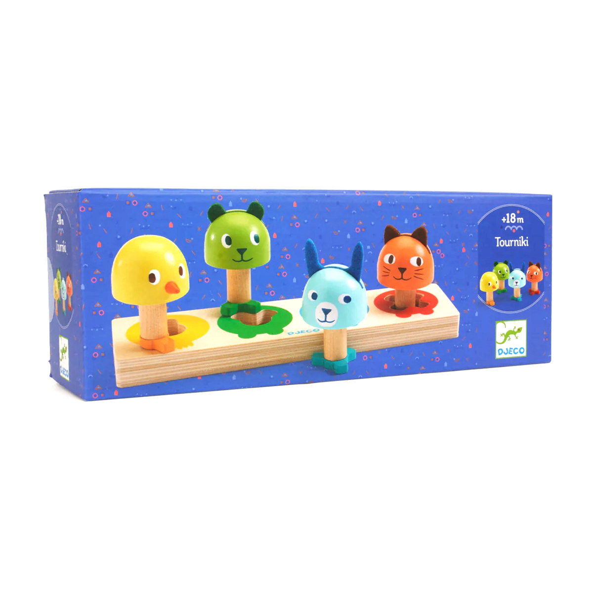 Tourniki è un avvita-svita base composto da 4 animaletti colorati in legno (altezza 9 cm) costituiti da un bastoncino con una testa tonda e dei piedini particolari, e una scatola in legno con gli alloggiamenti per gli animaletti, adatto a bimbi dai 18 mesi in su. I 4 animali, pulcino giallo, orsetto verde, coniglio azzurro e gatto arancio, sono diversi per colore e particolari della testa.